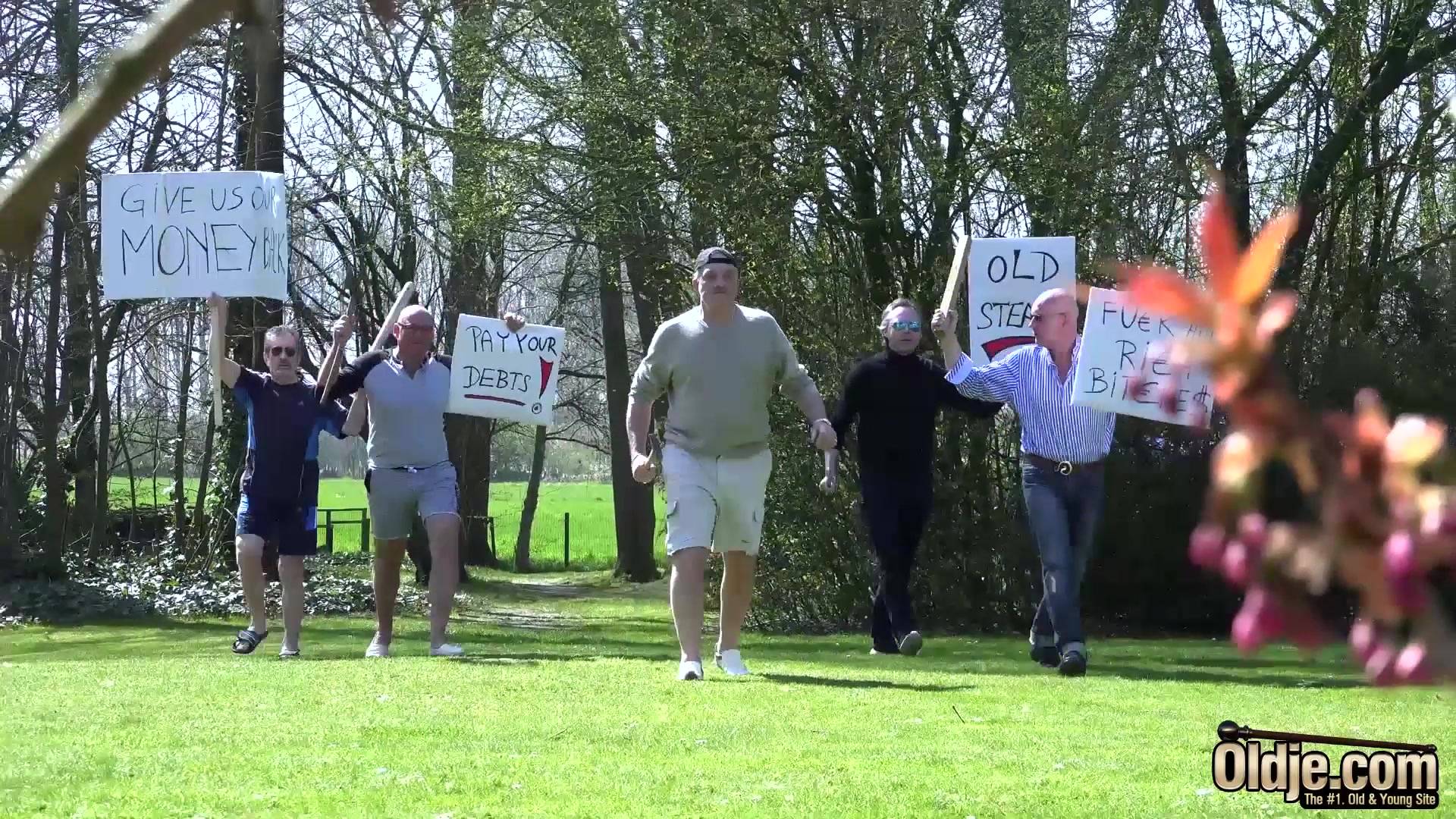 Старым дедам повезло трахнуть молодую девушку![]() Дедуля отдыхал с молодой девушкой возле дома. Погода была прекрасная и настроение его тоже, пока не раздался телефонный звонок. Это звонили его знакомые которые одолжили деду приличную суму денег. Старый пердун хотел как-то отвертеться и отдать деньги потом, но разъяренные кредиторы вломились через несколько минут на его территорию с транспорантами и плакатами, вымогая свои денежки назад. Толпа дедов начали ссориться, но предложили должнику вариант: он даст им трахнуть свою молодую знакомую. Мужчина неохотно, но уже почти был согласился, как деды сами набросились на молодое тело. Красотка была не против, а старым дедам повезло трахнуть молодую девушку.
